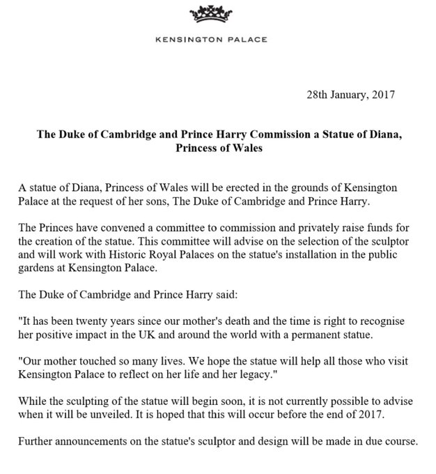 I na koniec jedna z ciekawszych wiadomości z ostatnich kilku dni! Książę Harry i William postanowili wybudować posąg księżnej Diany z okazji 20 rocznicy jej śmierci. Pomnik miałby znaleźć się na terenie ogrodów Pałacu Kensington, sfinansowany w całości przez Williama i Harry'ego. Obaj synowie chcą w ten sposób uczcić pamięć o matce, jej wpływie na wielu ludzi i całą Wielką Brytanię. Królowa wie o tym pomyśle i jak najbardziej popiera swoich wnuków.